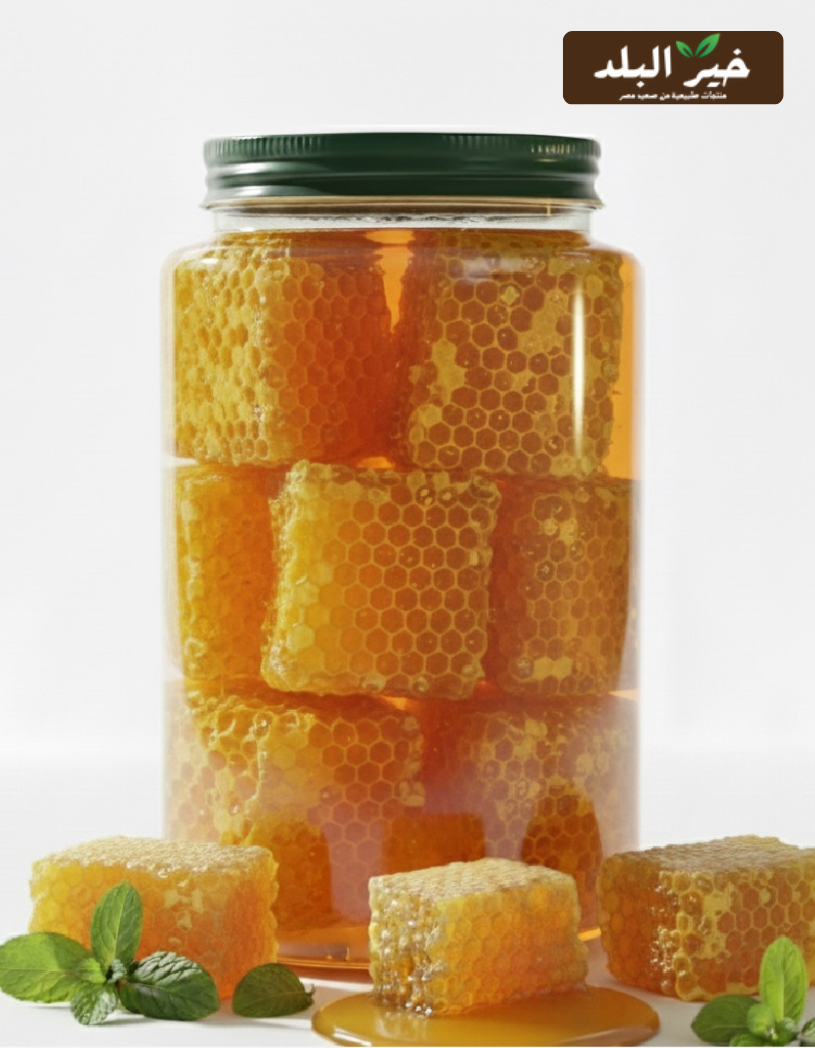 شمع العسل النقي المحفوظ في العسل هو من خير الطبيعية صالحة للأكل عبارة عن هيكل من الخلايا الشمعية سداسية الشكل من إنتاج أفضل انواع النحل في المناحل الطبيعية مملوء بالعسل اللذيذ والملمس شمعي رقيق والطعم لذيذ وهو كنز صحي بستحق التجربة